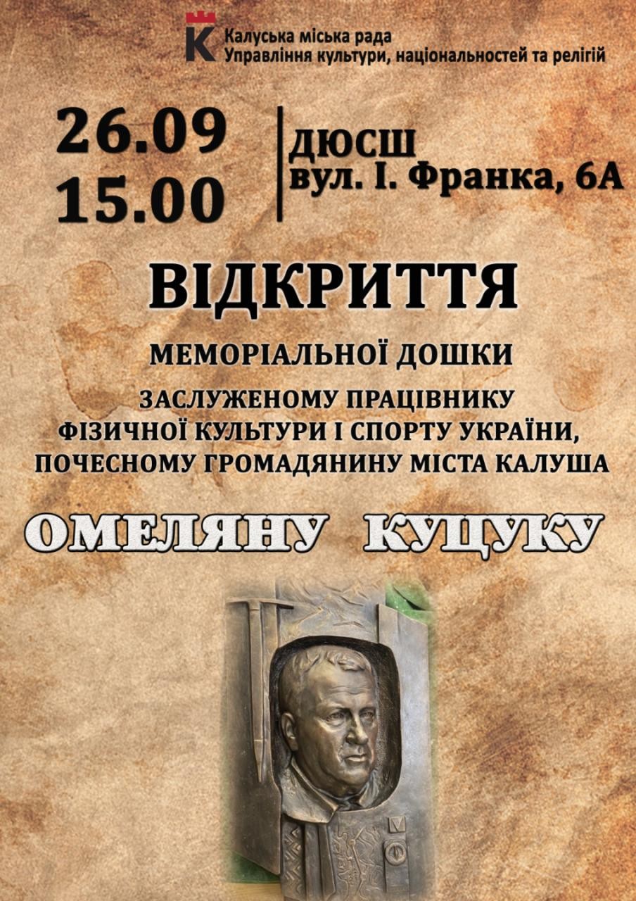 У п’ятницю, 26 вересня, у Калуші відбудеться відкриття меморіальної дошки заслуженому працівнику фізичної культури і спорту України, почесному громадянину міста Калуша Омелянові Куцуку.