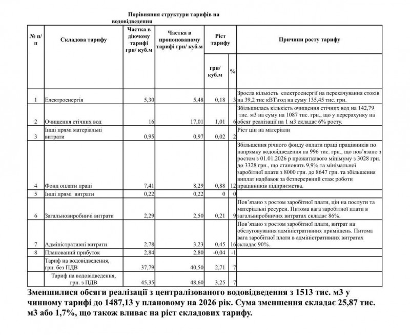 Таким чином, у разі ухвалення позитивного рішення виконавчим комітетом, з початку 2026 року тариф на послуги централізованого водопостачання та водовідведення зросте на 3,25 грн/м³ (з ПДВ), що становить близько 4,3%.