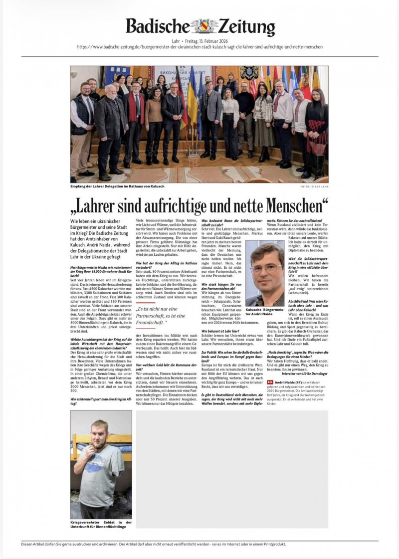 Щиро дякую німецьким виданням, зокрема LAHR UND REGION та Badische Zeitung, за увагу до Калуської громади, за чесний і людяний погляд на події в Україні, за прагнення донести до своїх читачів правду про війну і про людей, які живуть поруч із нею щодня.