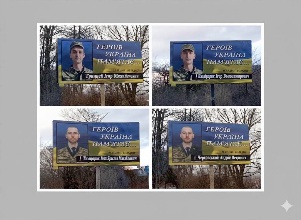Чотири білборди, розташовані на в'їзді в місто по два зі сторони сіл Вістова і Пійло, нагадують про загиблих Героїв із нашої громади: