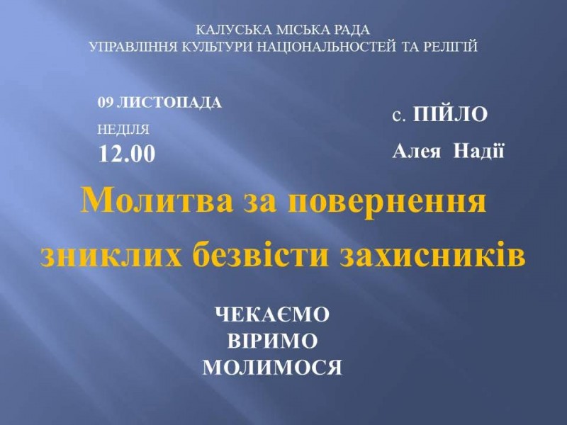 Цього ж дня о 12.00 на Алеї Надії у с. Пійло – молитва за повернення зниклих безвісти Захисників.
