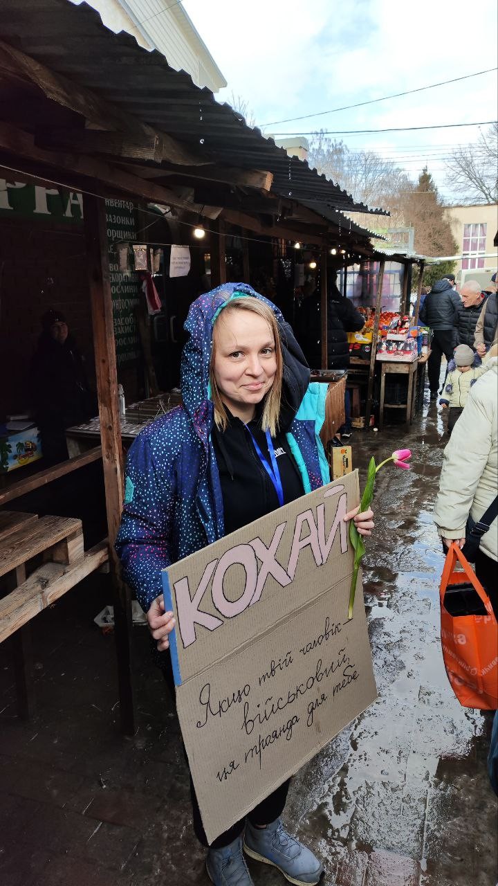 У руках ідейники акції тримали плакати з написом: «Кохай. Якщо твій чоловік військовий – ця троянда для тебе».