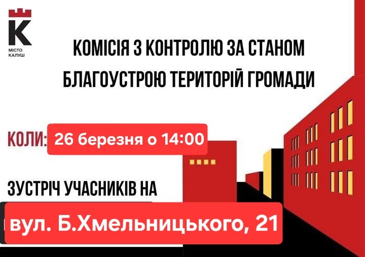 У четвер, 26 березня, у місті працюватиме постійно діюча комісія з контролю за станом благоустрою територій Калуської міської територіальної громади.