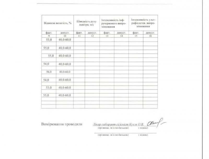відносна вологість повітря — 53,0–55,0% при нормі 40,0–60,0%.