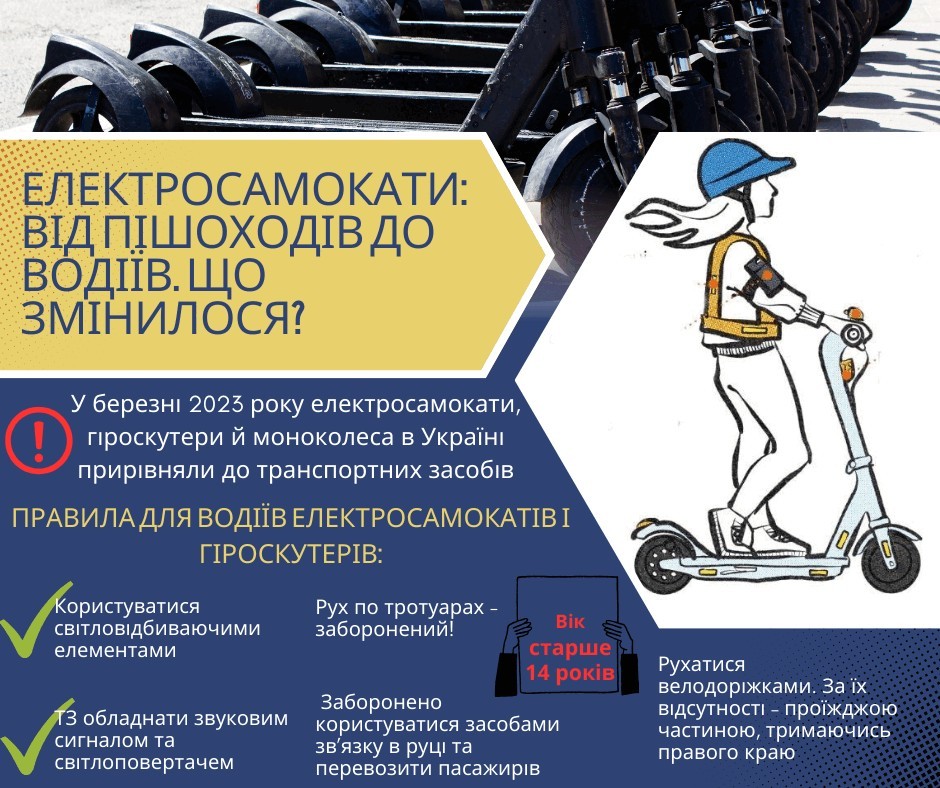 Муніципальна інспекція звертає увагу: за порушення Правил дорожнього руху під час керування електросамокатами, гіроскутерами та моноколесами передбачена адміністративна відповідальність. У випадку наїзду на пішоходів та завдання їм тілесних ушкоджень – настає кримінальна відповідальність.