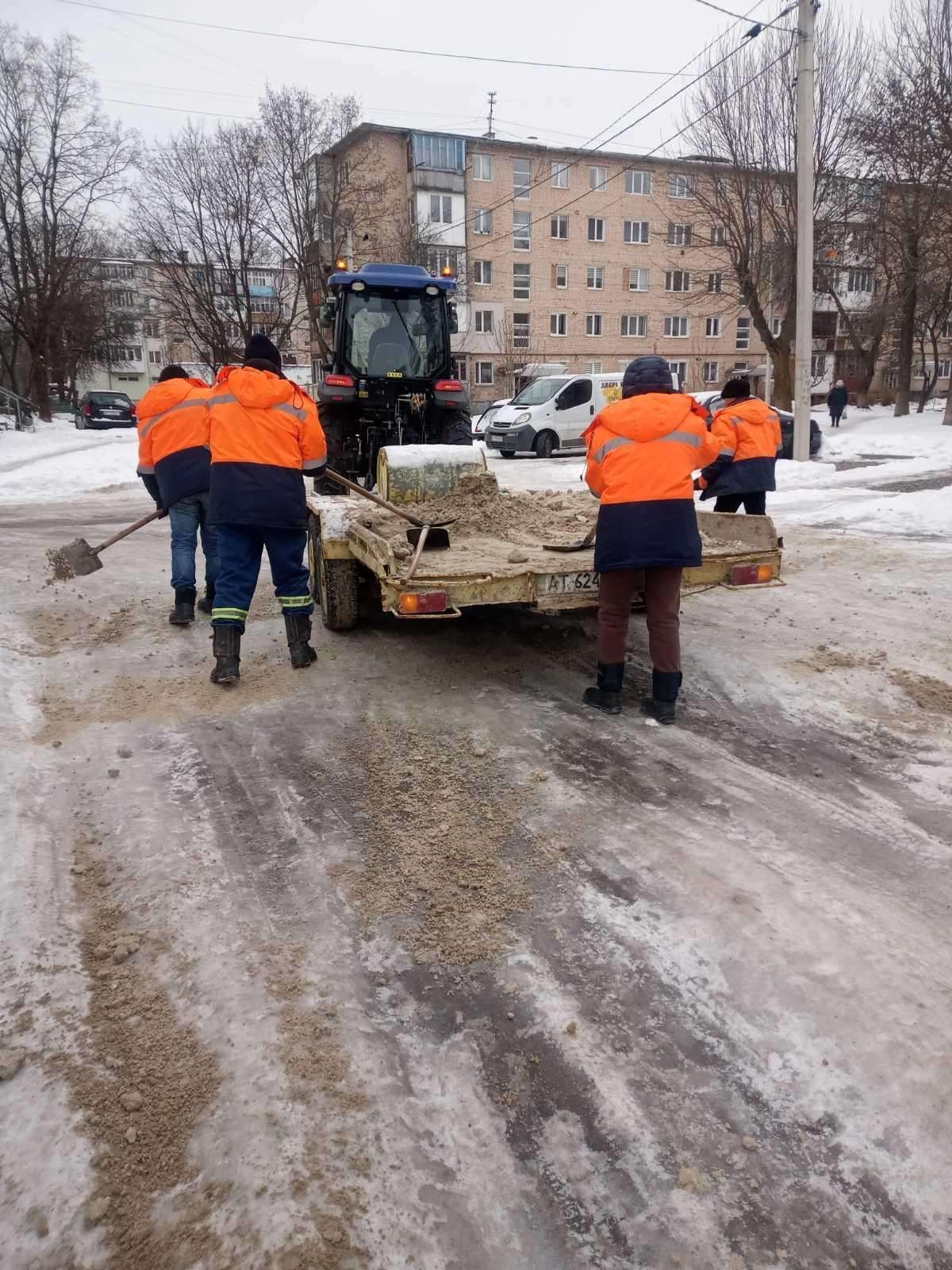 Від ранку проводиться посипання доріг, тротуарів, пішохідних зон та зупинок громадського транспорту протиожеледними матеріалами. Особлива увага приділяється аварійно небезпечним ділянкам, підйомам і спускам, а також територіям поблизу соціально важливих об’єктів.