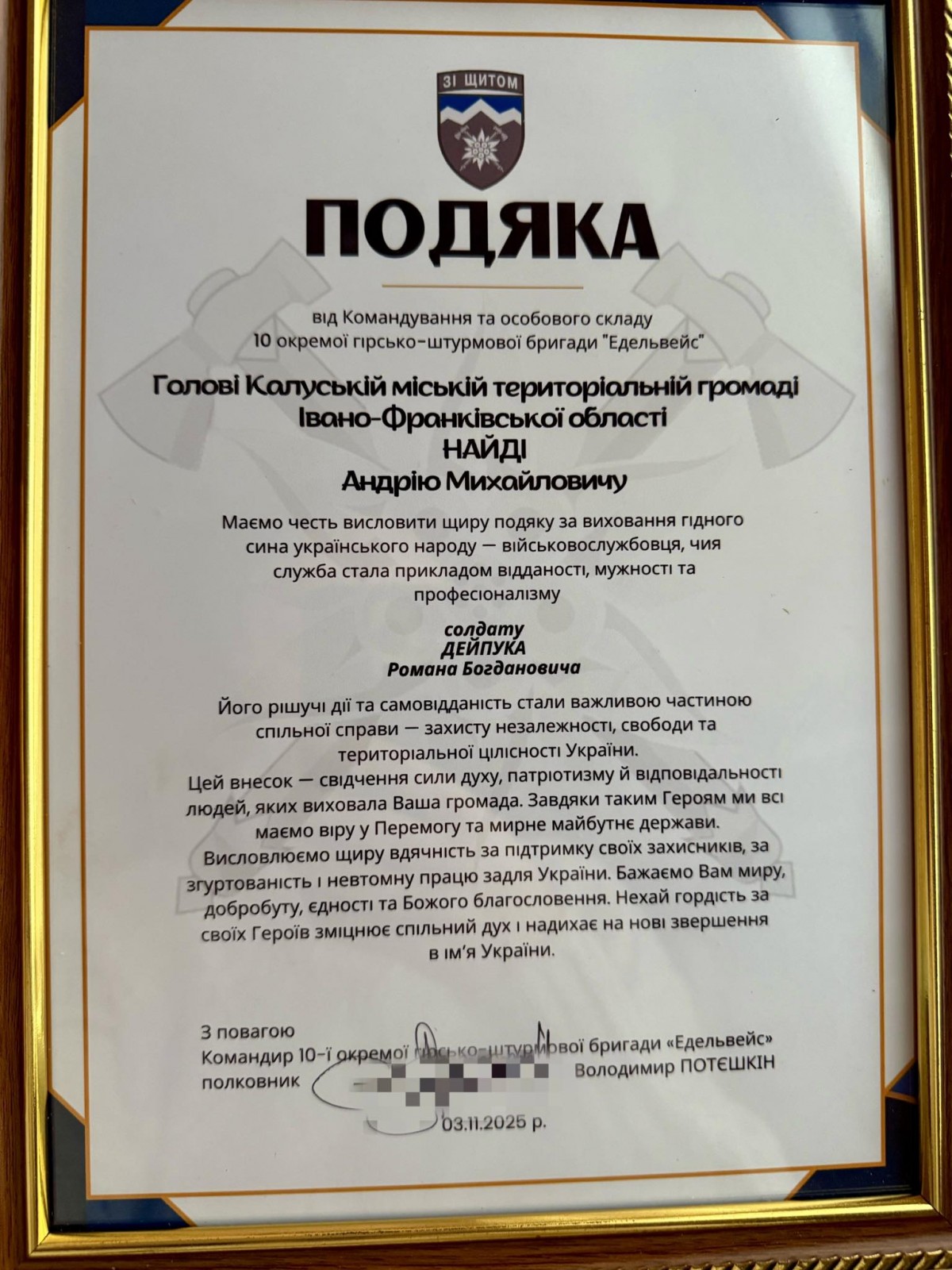 Калуська громада отримала почесну подяку від командування та особового складу 10-ї окремої гірсько-штурмової бригади «Едельвейс». Насамперед ця відзнака є виявом глибокої шани та вдячності нашому земляку — солдату Роману Дейпуку, який гідно, мужньо та віддано боронить незалежність і територіальну цілісність України.