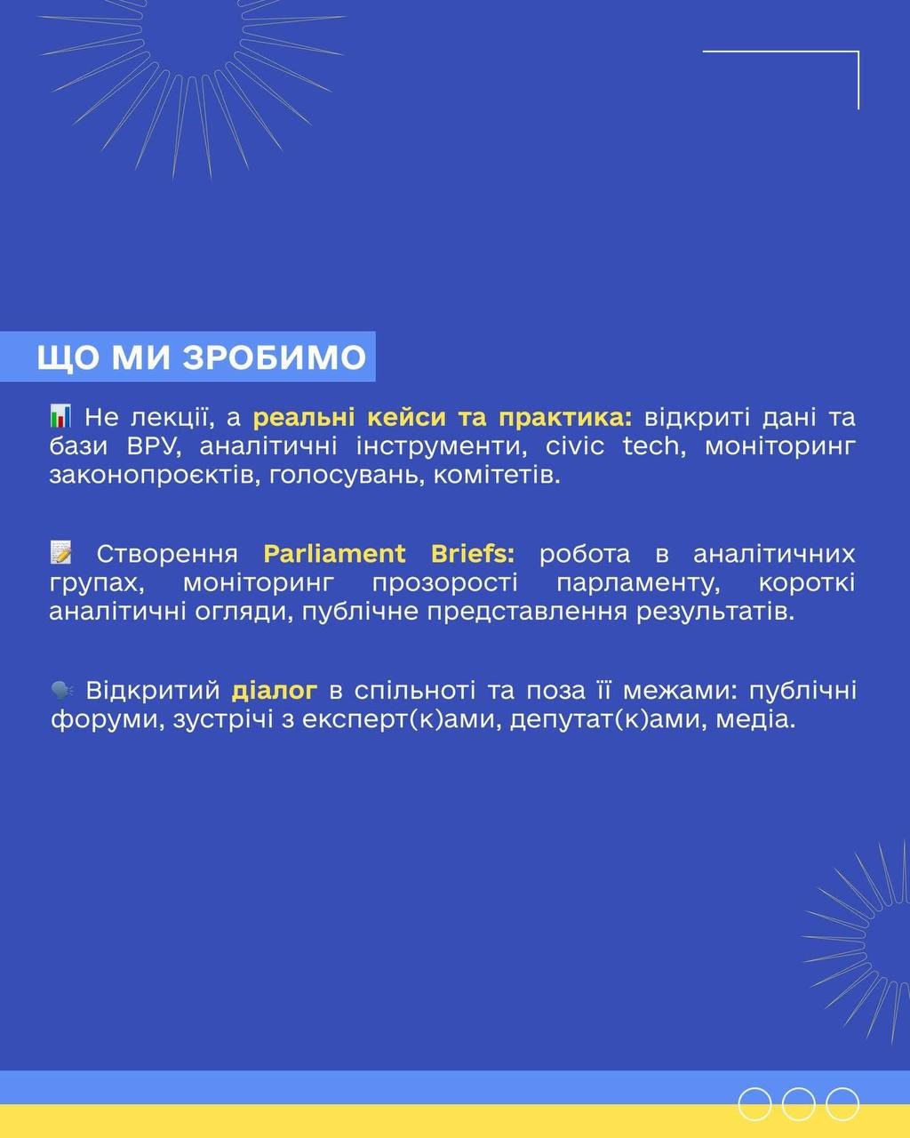 Участь у проєкті — гарна можливість проявити себе, набути важливого для подальшої професійної діяльності досвіду, познайомитися з однодумцями з усієї України, взяти участь у розробці аналітичних кейсів, а що найважливіше — дізнатися, як працює Верховна Рада України зсередини.
