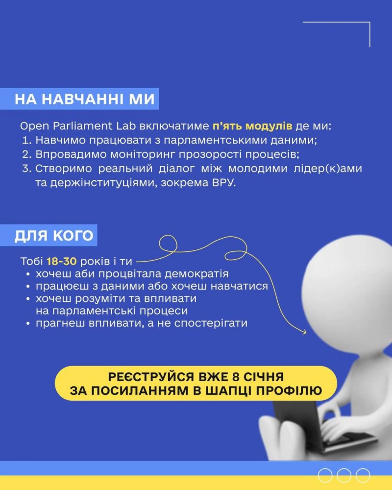 ‼️ У межах проєкту буде створено молодіжну лабораторію парламентської прозорості Open Parliament Lab, де учасни(ці)ки пройдуть п’ять навчально-практичних модулів:
