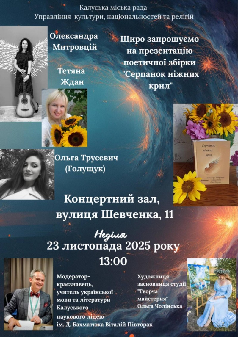 13:00 — презентація поетичної збірки Олександри Митровцій, Тетяни Ждан, Ольги Трусевич (Голущук) "Серпанок ніжних крил", концертна зала (м. Калуш, вул. Т. Шевченка, 11);
