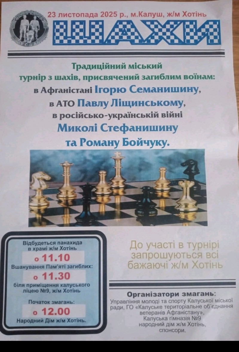 12:00 — традиційний шаховий турнір серед молоді, присвячений загиблим воїнам житлового масиву Хотінь Ігорю Семанишину, Павлу Ліщинському, Миколі Стефанишину та Роману Бойчуку, Народний дім ім. Гната Рожанського (житловий масив Хотінь);