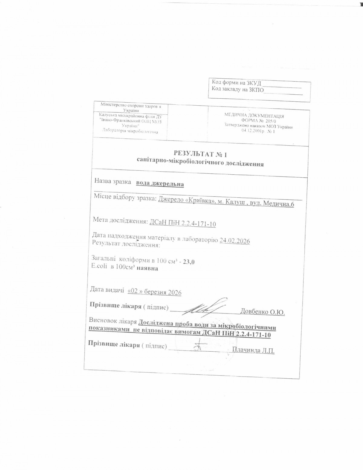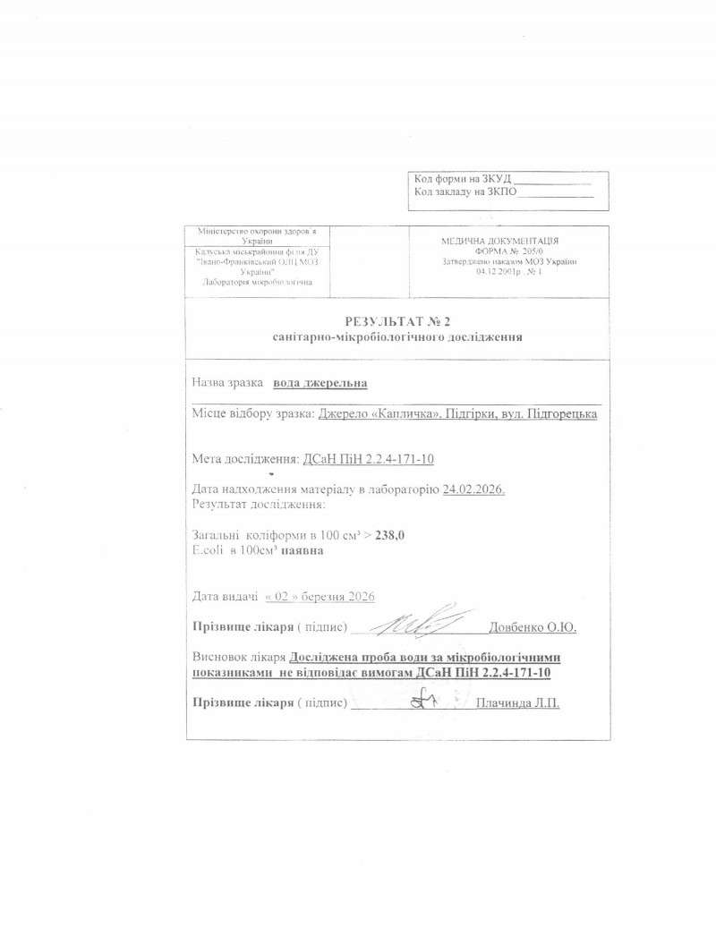 Проба води з джерела «Криївка» (вул. Медична, 6, м. Калуш) за показниками епідемічної безпеки не відповідає вимогам Додатку 1 ДСанПіну 2.2.4.-171-10 «Гігієнічні вимоги до води питної, призначеної для споживання людиною», а саме: - в 100 см³ води виділено загальні колі форми - 23,0 при допустимій нормі <=1 та E.coli (кишкова паличка), яка в нормі відсутня.