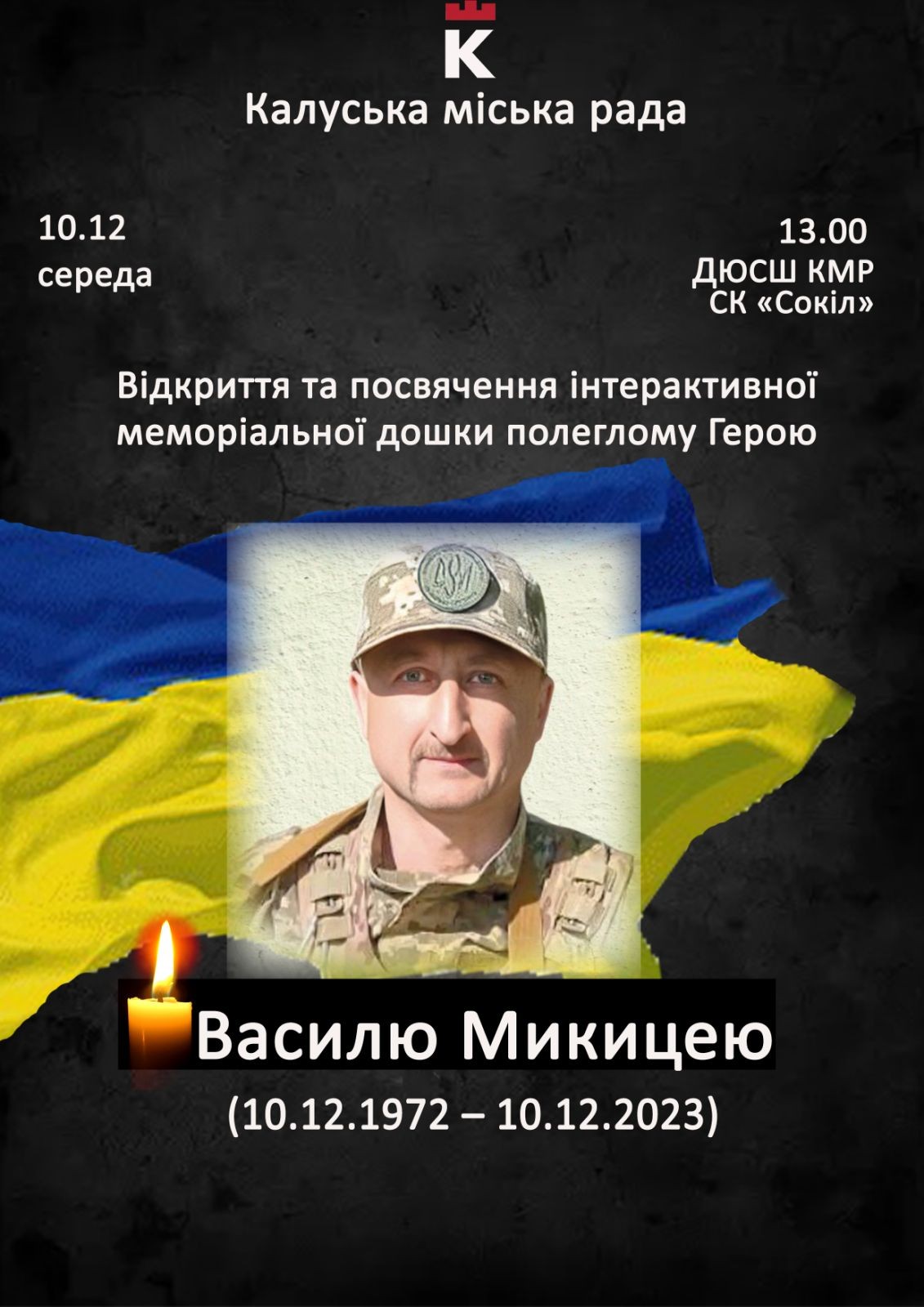 У середу, 10 грудня, у Калуші відбудеться відкриття і посвячення інтерактивної меморіальної дошки загиблому Героєві Василю Микицею (10.12.1972 – 10.12.2023).