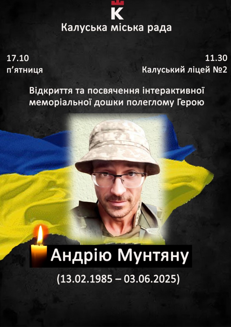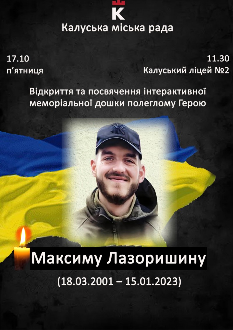 Відкриття та освячення інтерактивних меморіальних дощок відбудеться у п’ятницю, 17 жовтня, у Калуському ліцеї №2 (м. Калуш, пр. Лесі Українки, 11).