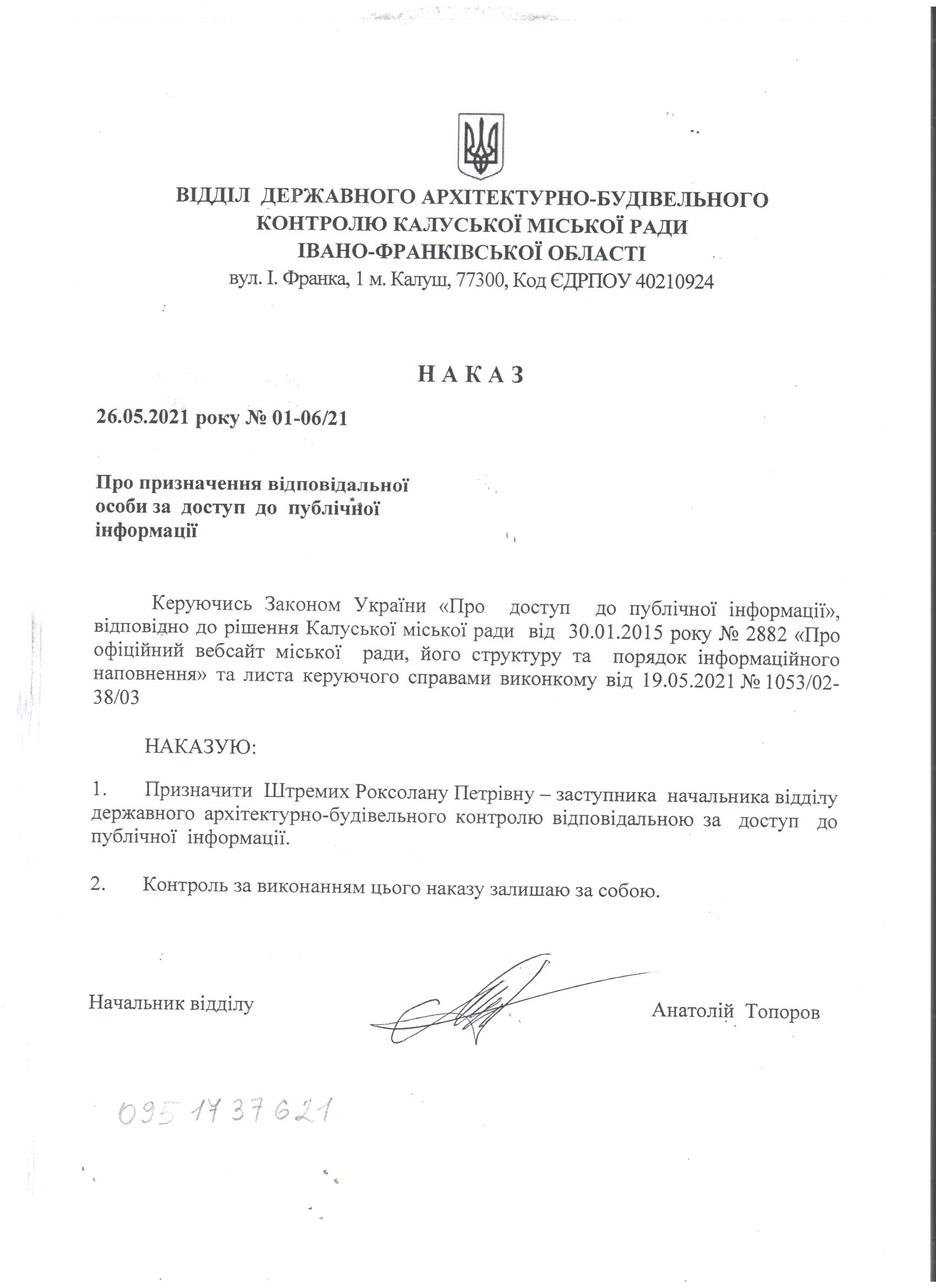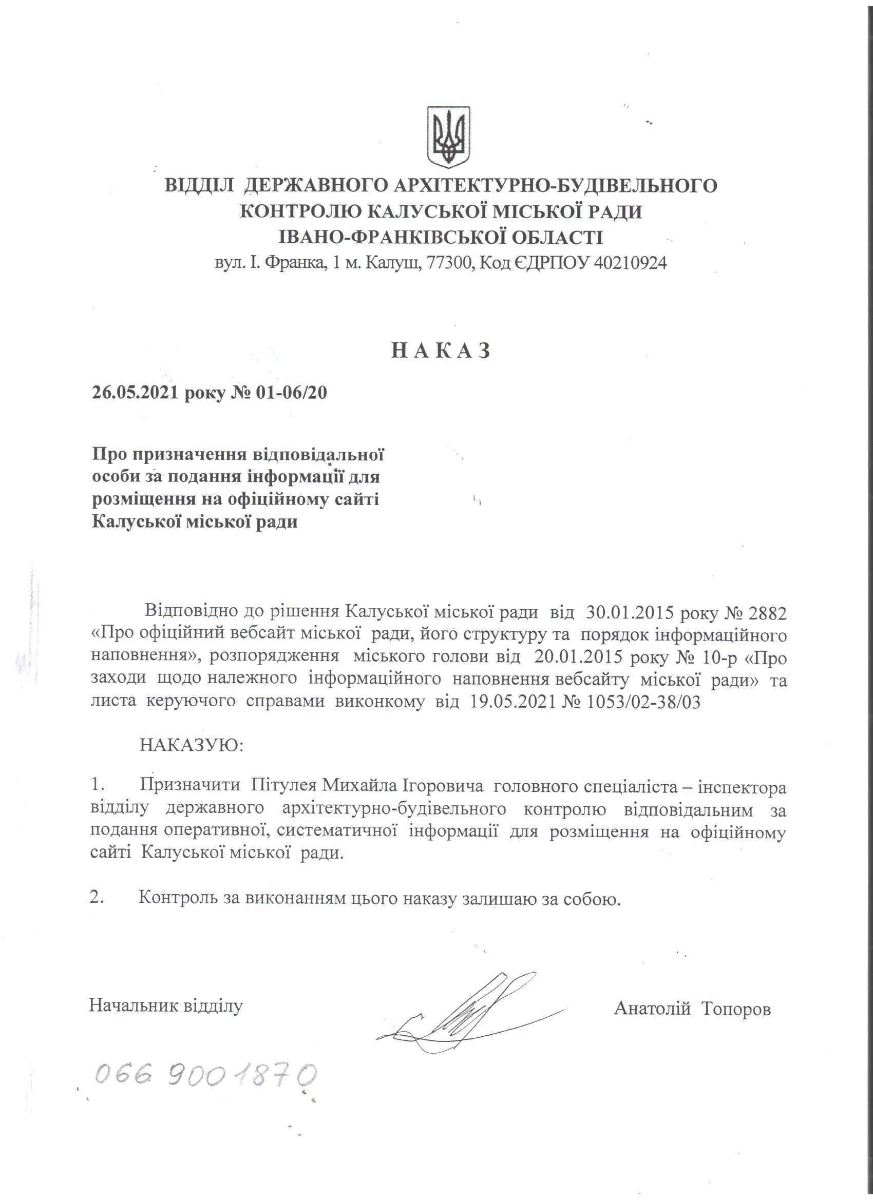 • Наказ від 26.05.2021 р №01-06/20 про призначення відповідальних осіб