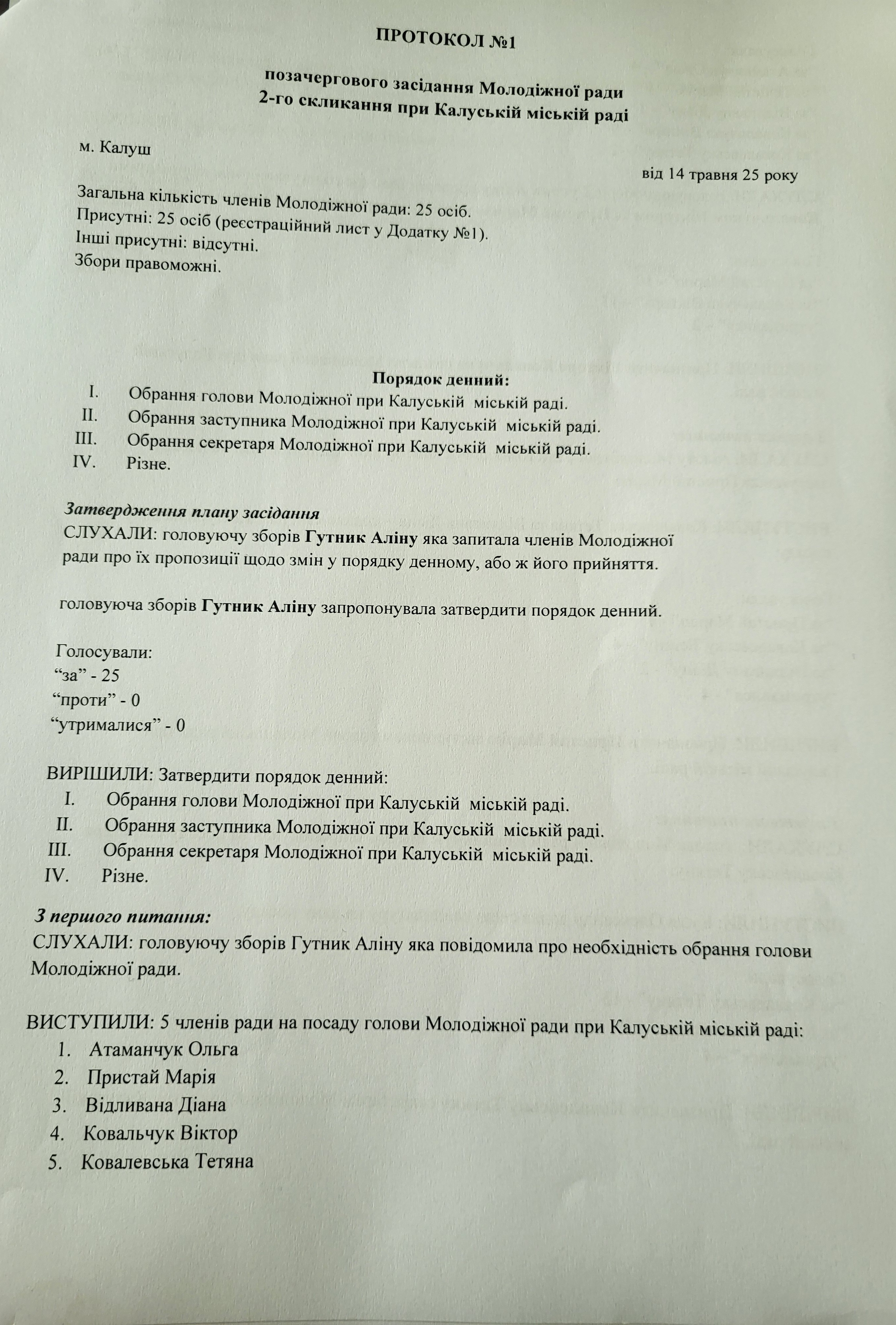 • ПРОТОКОЛ №5 чергового засідання Молодіжної ради 2-го скликання при Калуській міській раді від 1 вересня 25 року