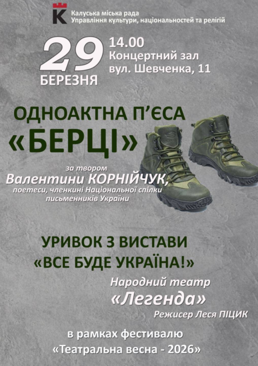 Відбудеться показ одноактної п’єси «Берці» за твором калушанки, поетеси, членкині Національної спілки письменників України Валентини Корнійчук.