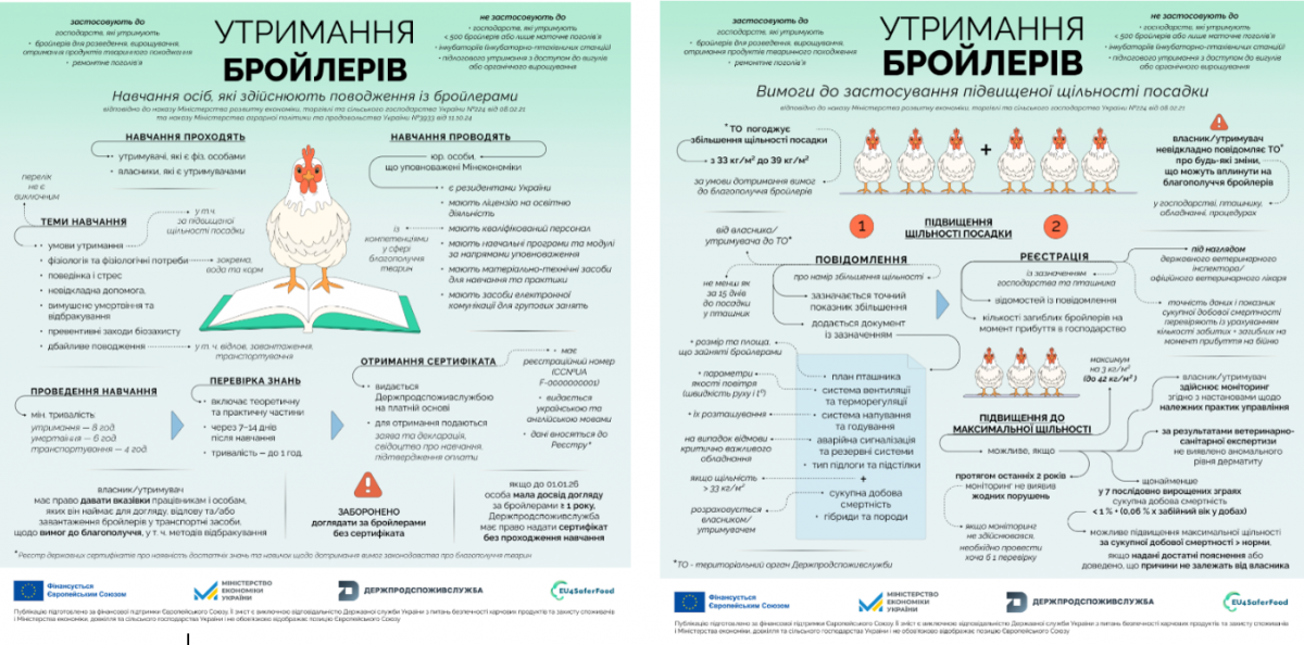 Спільно з Міністерством економіки, довкілля та сільського господарства України та європейським проєктом EU4SaferFood розроблено інфографіки, де коротко показано вимоги щодо благополуччя бройлерів під час їх утримання.