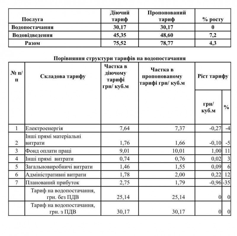 Загальна вартість послуги з централізованого водопостачання та водовідведення становитиме 78,77 грн/м³ (з ПДВ).