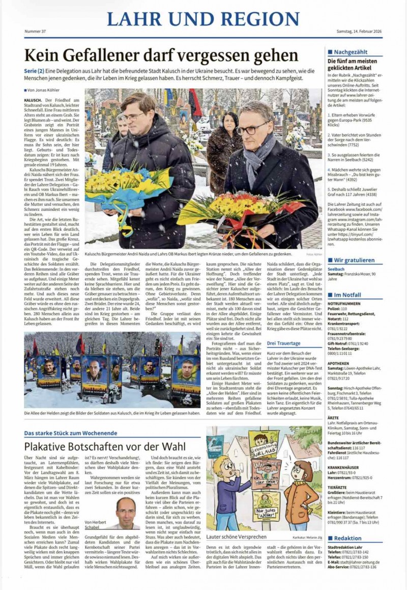 Щиро дякую німецьким виданням, зокрема LAHR UND REGION та Badische Zeitung, за увагу до Калуської громади, за чесний і людяний погляд на події в Україні, за прагнення донести до своїх читачів правду про війну і про людей, які живуть поруч із нею щодня.
