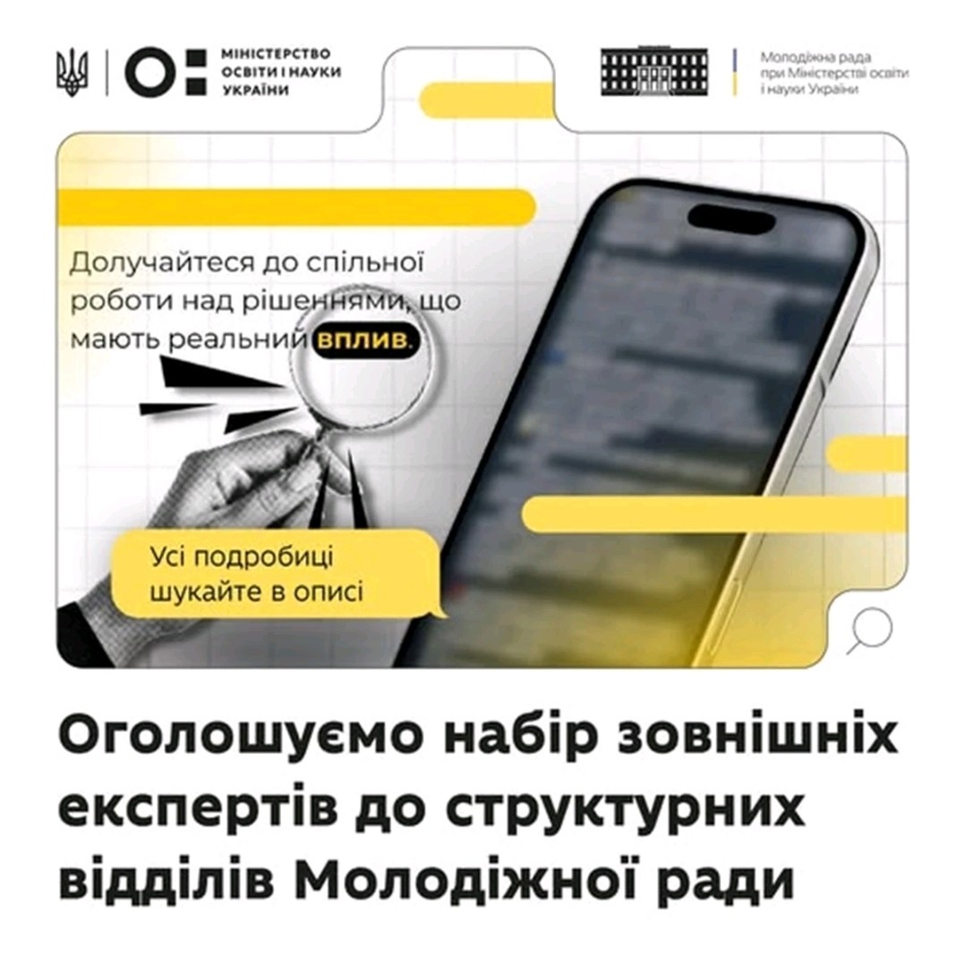 Молодіжна рада при Міністерстві освіти і науки України запрошує молодь віком від 14 до 35 років (включно), яка має експертизу, практичний досвід і бажання долучитися до формування рішень державної політики у сферах освіти і науки, наукової, науково-технічної, а також інноваційної діяльності.