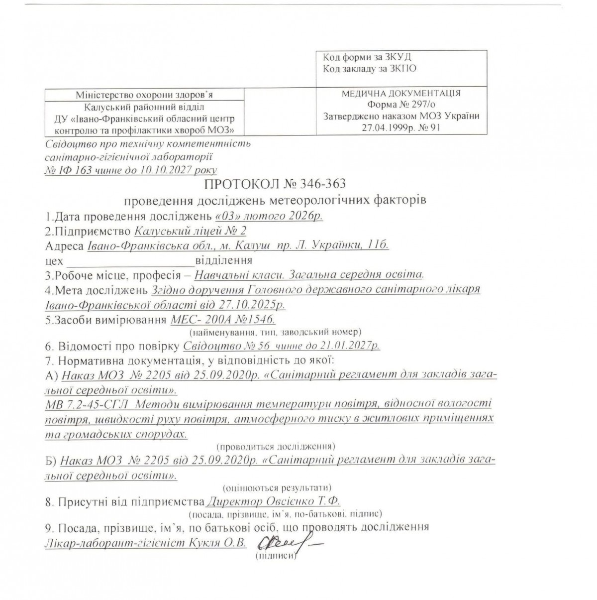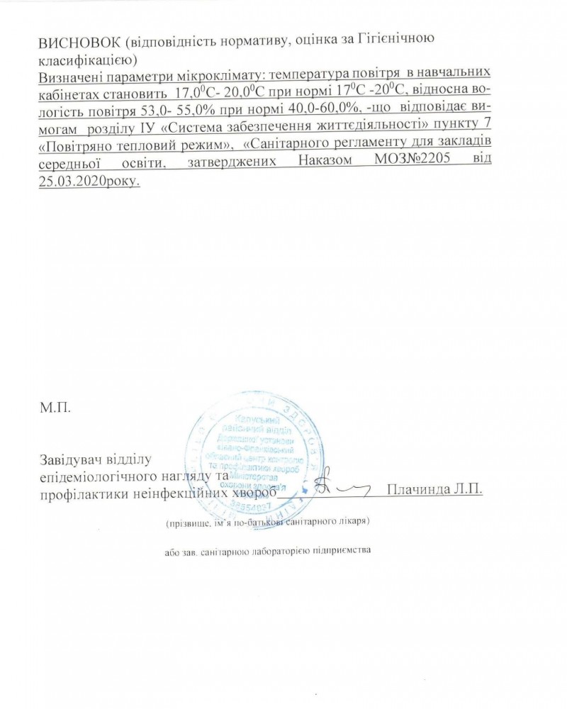 Такі показники відповідають вимогам пункту 7 «Повітряно-тепловий режим» розділу «Система забезпечення життєдіяльності» Санітарного регламенту для закладів загальної середньої освіти, затвердженого наказом МОЗ №2205 від 25 березня 2020 року.