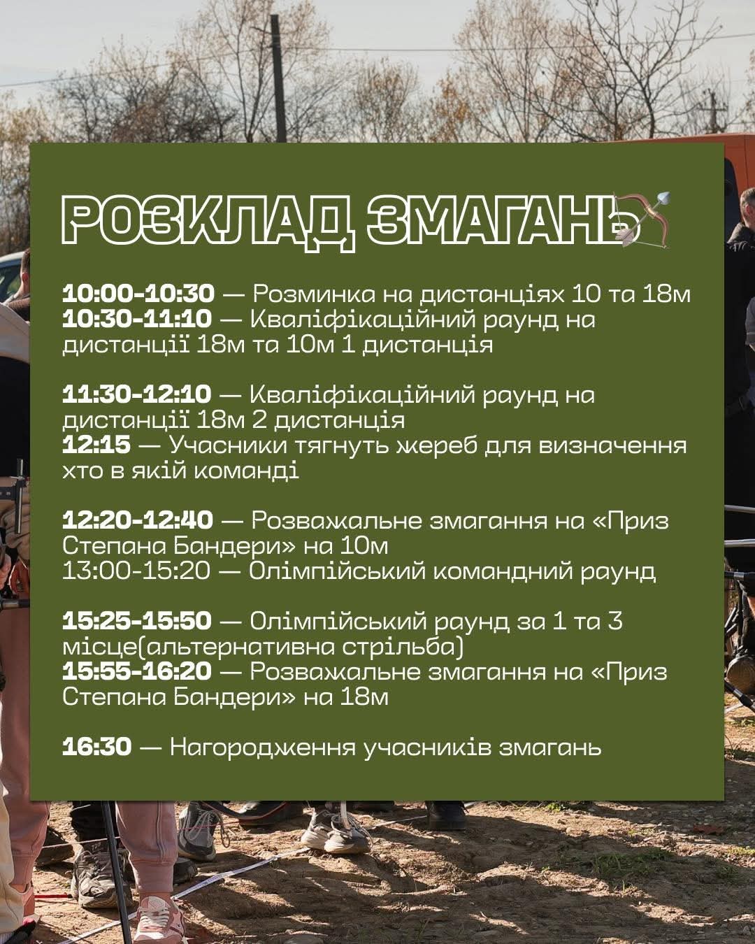 Змагання проходитимуть в особистому та командному заліках. У командному виді програми спортсмени змагатимуться зі стрільби з олімпійського лука на дистанції 18 метрів. Також у межах турніру відбудеться розважальне змагання «Приз Степана Бандери» на дистанціях 18 м та 10 м.