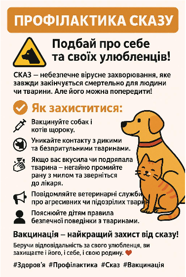 Сказ – це вірусне захворювання, яке має найвищий рівень смертності серед усіх інфекційних хвороб для людини. Вірус сказу вражає центральну нервову систему і після появи симптомів без вчасно розпочатого лікування стає невиліковним – 100% хворих людей помирають.