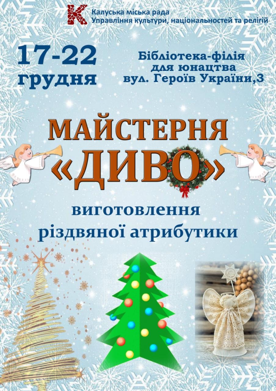 Управління культури, національностей та релігій Калуської міської ради запрошує всіх бажаючих поринути у чарівну атмосферу свята та взяти участь у виготовленні різдвяної атрибутики у майстерні «ДИВО».
