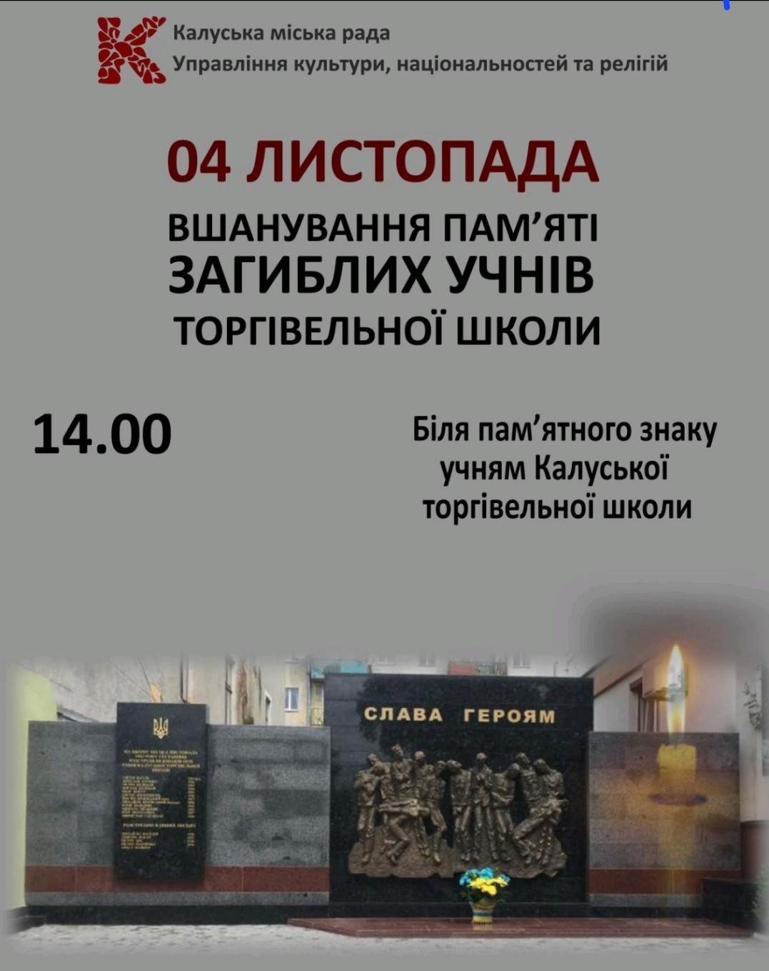 У вівторок, 4 листопада, у Калуші відбудеться захід із вшанування пам’яті загиблих учнів Калуської торговельної школи.