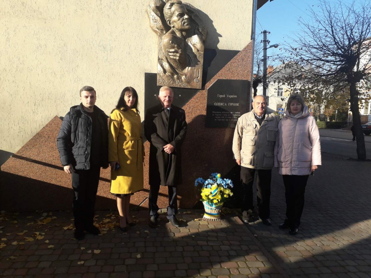 Заступниці міського голови Надія Гуш та Наталія Кінаш, керуючий справами виконкому Олег Савка, народний депутат України 4-го скликання Євген Гірник та учасники ХІХ Традиційного турніру з шахів пам'яті Героя України Олекси Гірника, офіційне відкриття якого відбудеться сьогодні у спортивній залі Голинського ліцею о 11.30 годині, поклали квіти до пам'ятного знаку українському патріоту в місті Калуш.