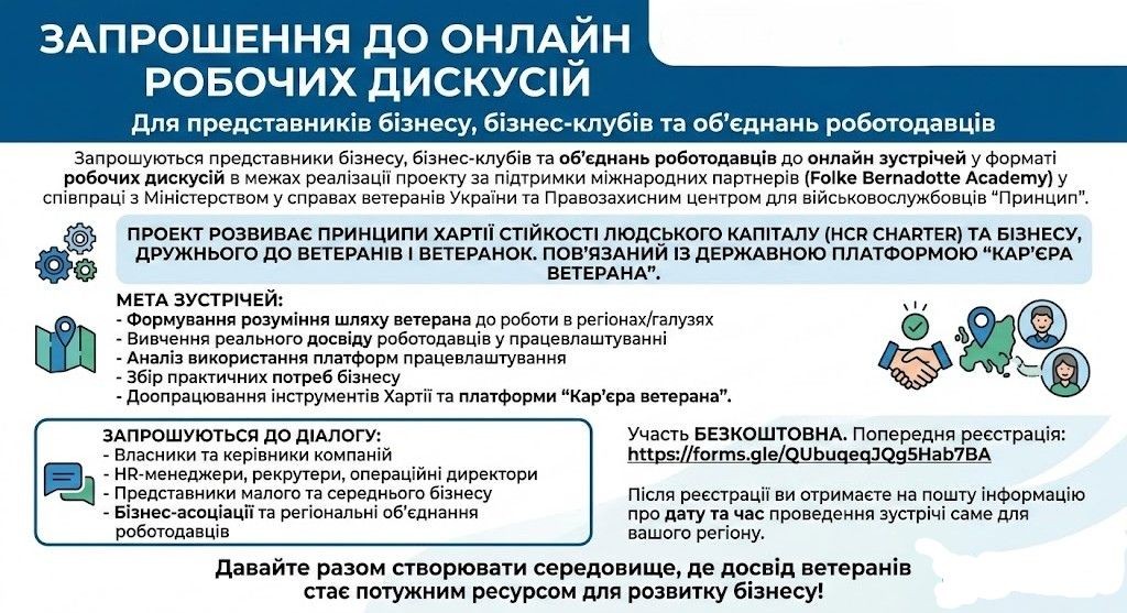 Запрошуються представники бізнесу, бізнес-клубів та об’єднань роботодавців до онлайн зустрічей у форматі робочих дискусій в межах реалізації проекту за підтримки міжнародних партнерів (Folke Bernadotte Academy) у співпраці з Міністерством у справах ветеранів України та Правозахисним центром для військовослужбовців “Принцип”.