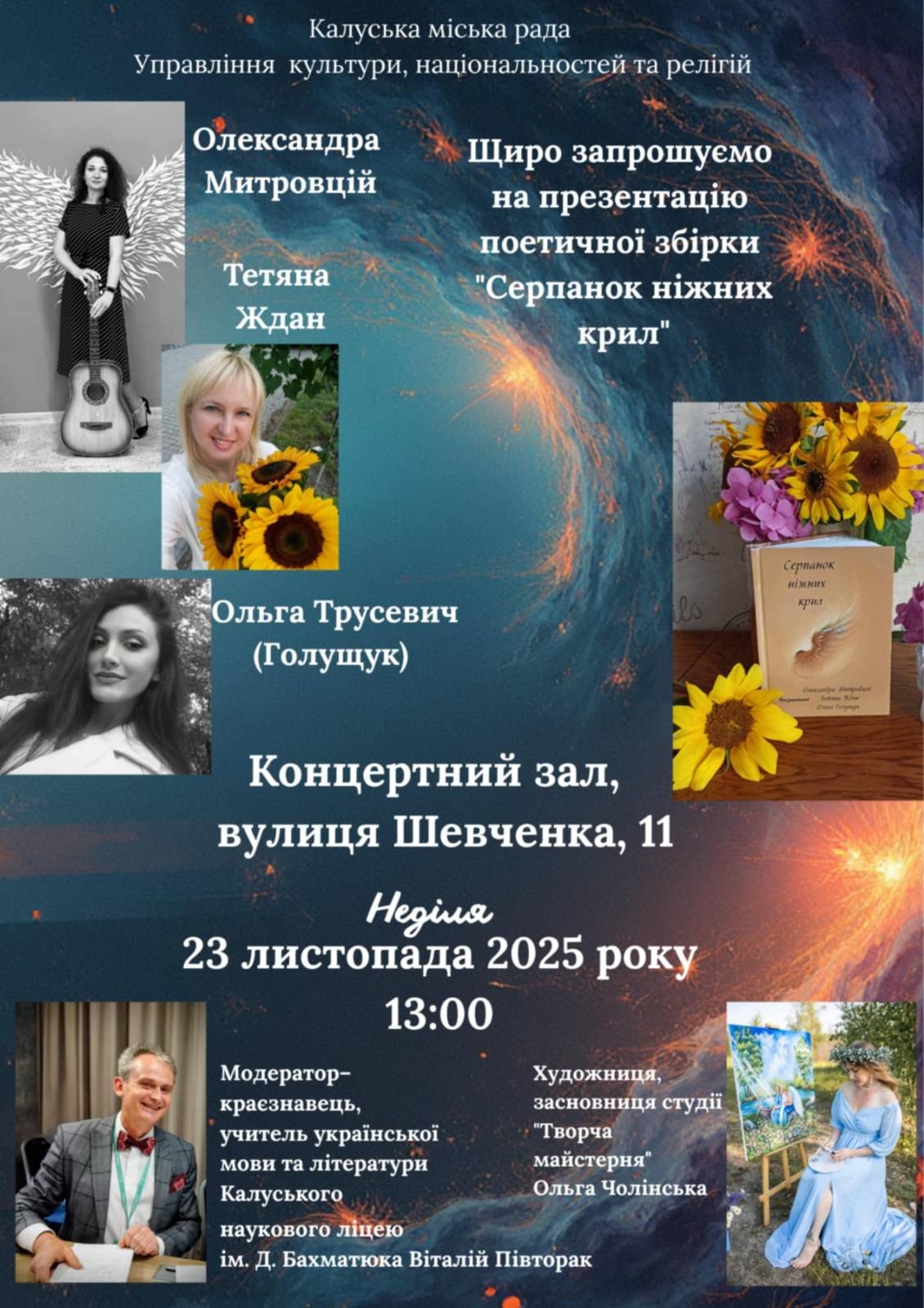 13:00 — презентація поетичної збірки Олександри Митровцій, Тетяни Ждан, Ольги Трусевич (Голущук) "Серпанок ніжних крил", концертна зала (м. Калуш, вул. Т. Шевченка, 11);