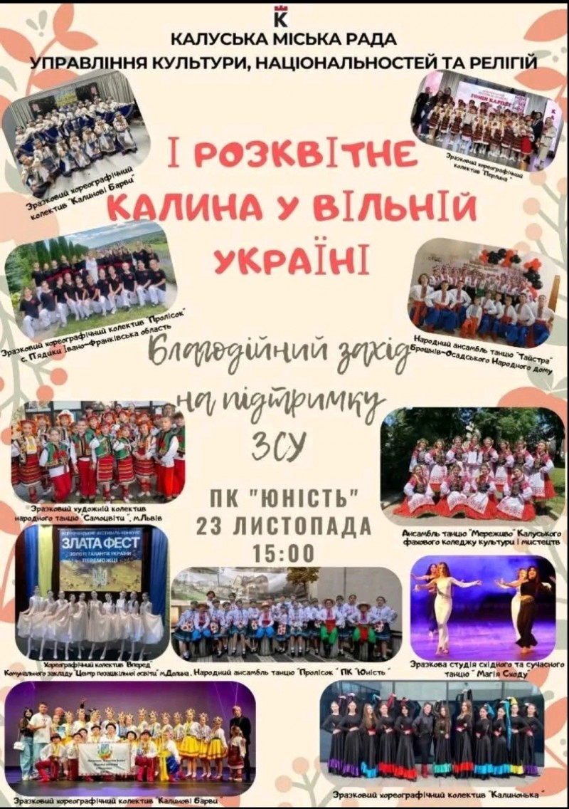 15:00 — благодійний захід на підтримку ЗСУ «І розквітне калина у вільній Україні» за участі кращих танцювальних колективів Прикарпаття, ПК "Юність" (м. Калуш, вул. О. Тихого, 6).