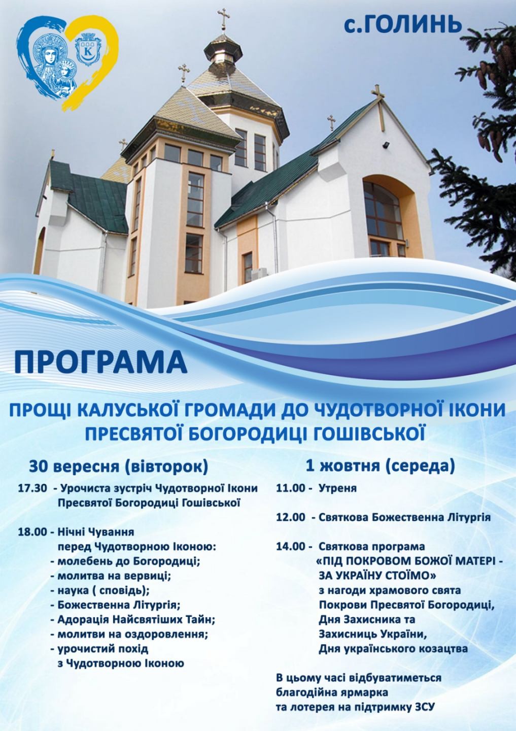 Калуська громада запрошує вірян до участі у прощі до Чудотворної ікони Пресвятої Богородиці Гошівської, яка відбудеться у с. Голинь (парафія Покрови Пресвятої Богородиці, вул. 600-річчя Голиня).