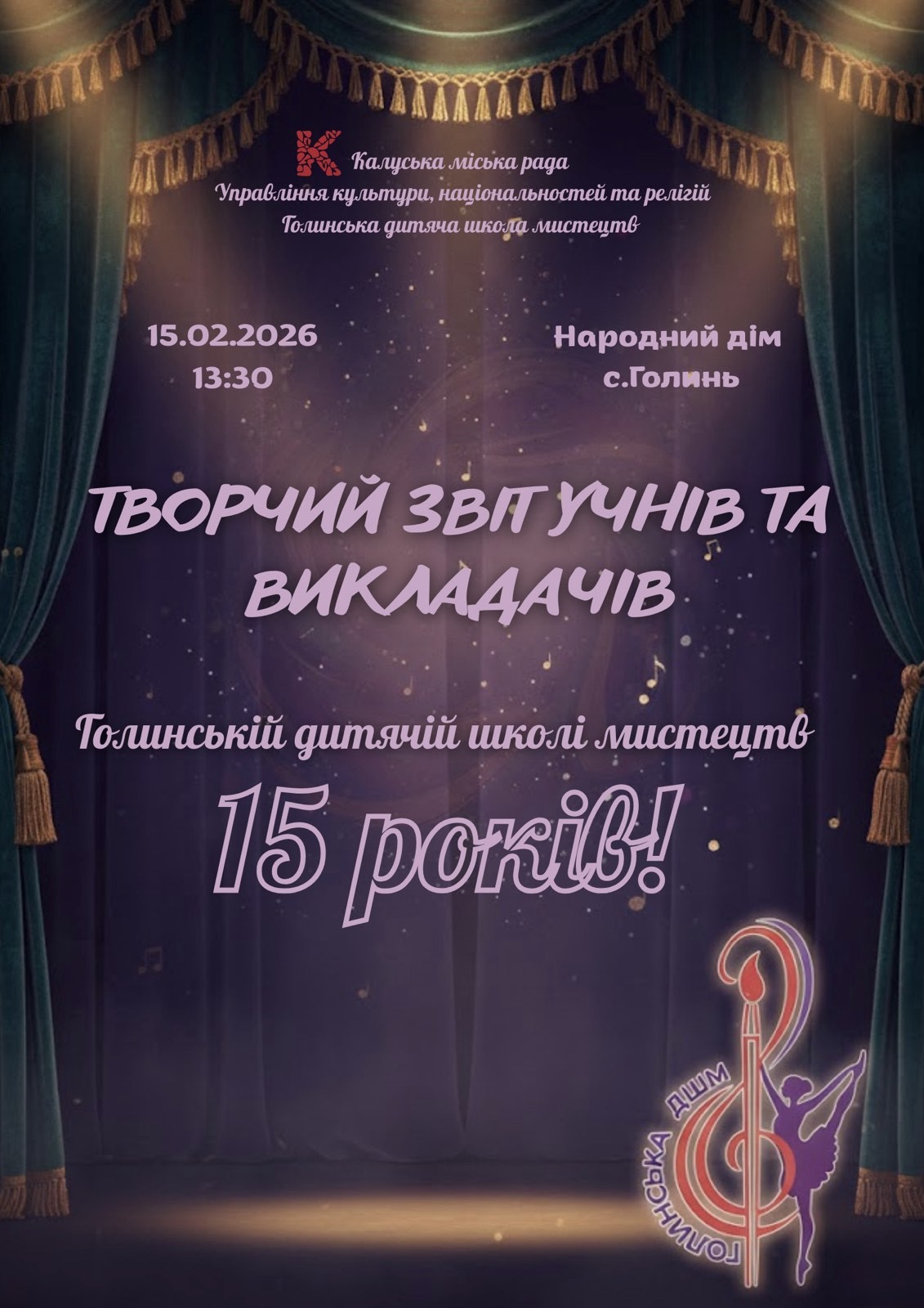- 13:30 — творчий звіт учнів і викладачів "Голинській дитячій школі мистецтв — 15 років", Народний дім с. Голинь;