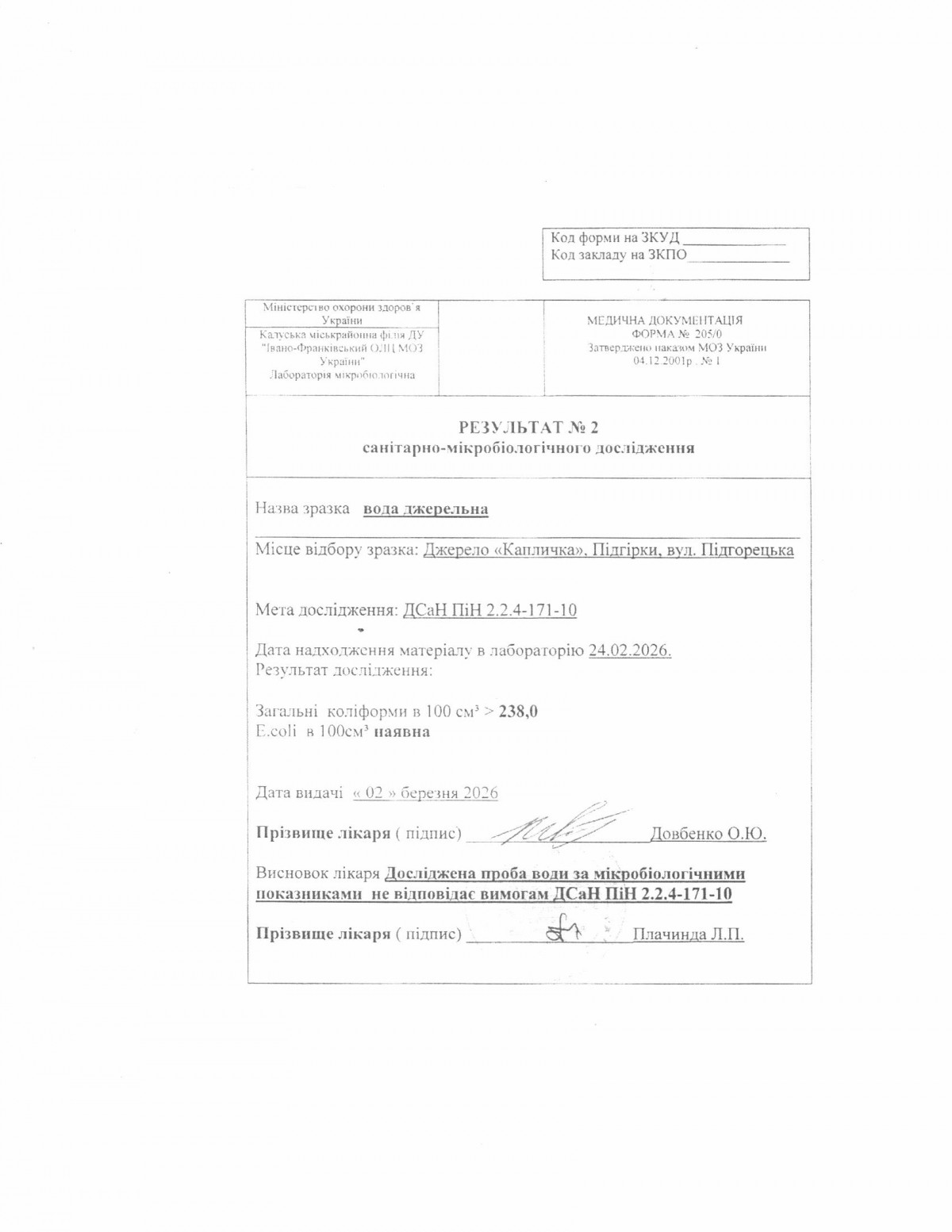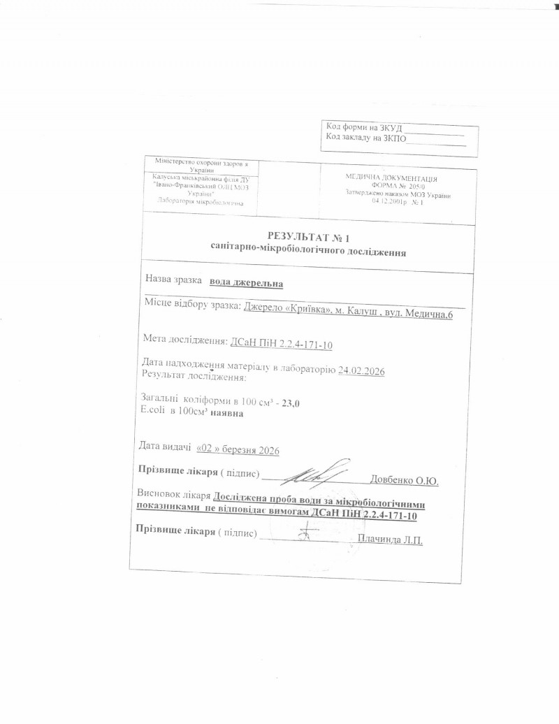Проба води з джерела «Криївка» (вул. Медична, 6, м. Калуш) за показниками епідемічної безпеки не відповідає вимогам Додатку 1 ДСанПіну 2.2.4.-171-10 «Гігієнічні вимоги до води питної, призначеної для споживання людиною», а саме: - в 100 см³ води виділено загальні колі форми - 23,0 при допустимій нормі <=1 та E.coli (кишкова паличка), яка в нормі відсутня.