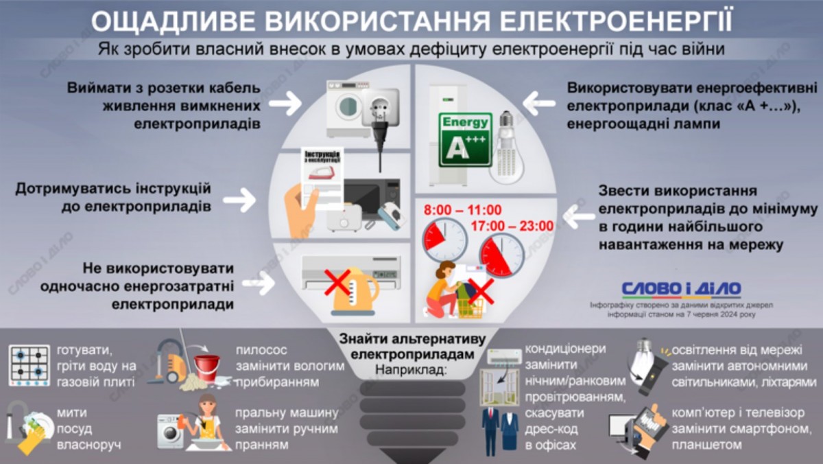 З метою стабілізації ситуації, яка склалась в об’єднаній енергетичній системі України, енергетики закликають громадян використовувати енергію ощадливо та розумно. Ощадливе споживання електроенергії допомагає уникнути відключень та допомагає енергосистемі країни.