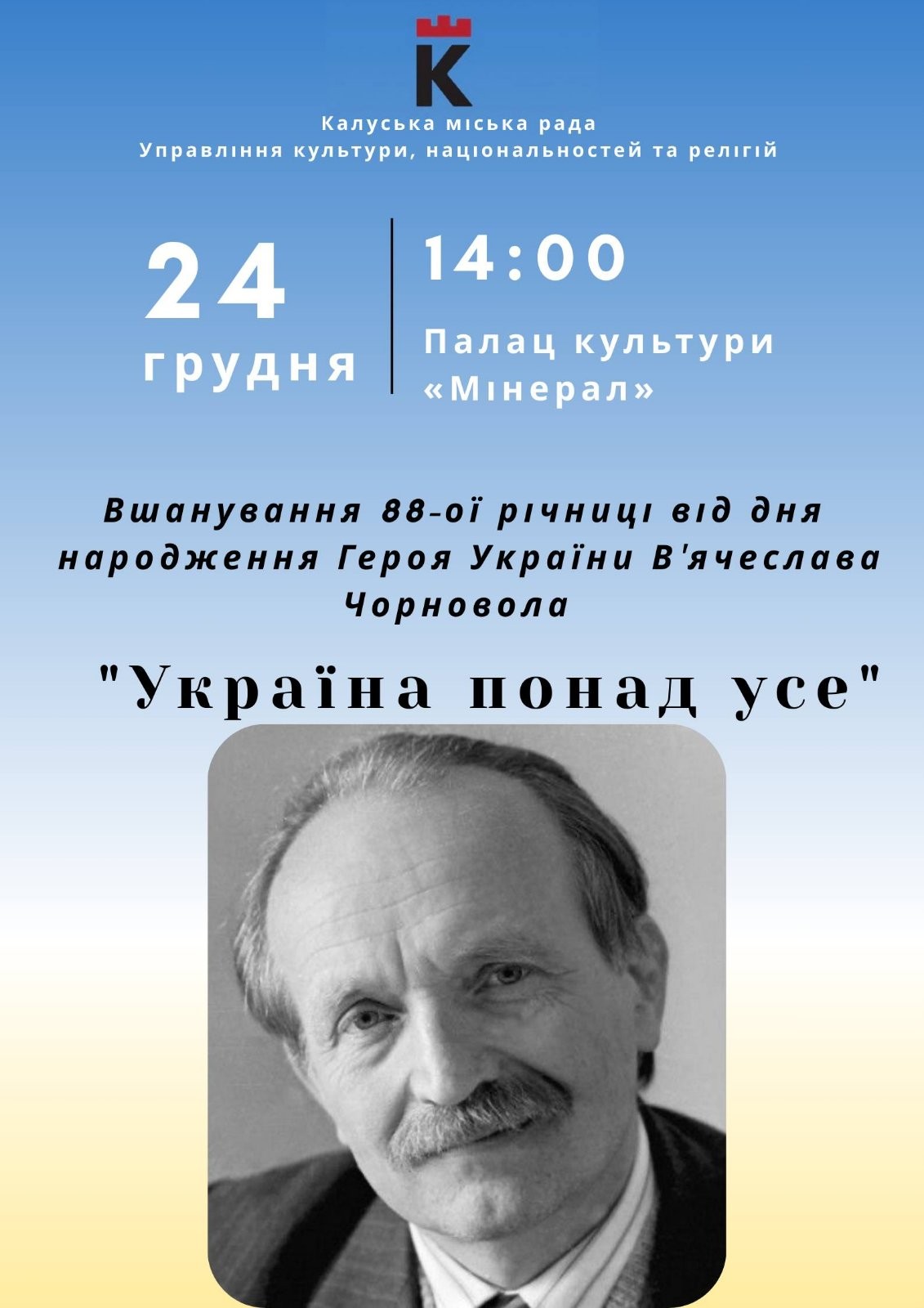 24 грудня Україна відзначатиме 88-му річницю від дня народження визначного державного та політичного діяча, символу українського духу та незламності — В’ячеслава Чорновола.